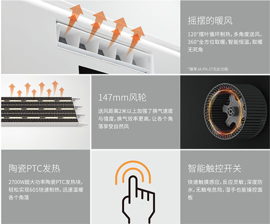 陶瓷PTC加熱,通過不斷循環(huán)來提高浴室溫度,送熱極為均勻。2700W大功率, 雙核動力,高制熱量系統(tǒng)設計,使發(fā)熱效率更高,熱損耗更低。高制熱,快速溫暖空間, 不僅讓您暢享沐浴時光,即便在洗漱更衣區(qū)也可享受溫暖。